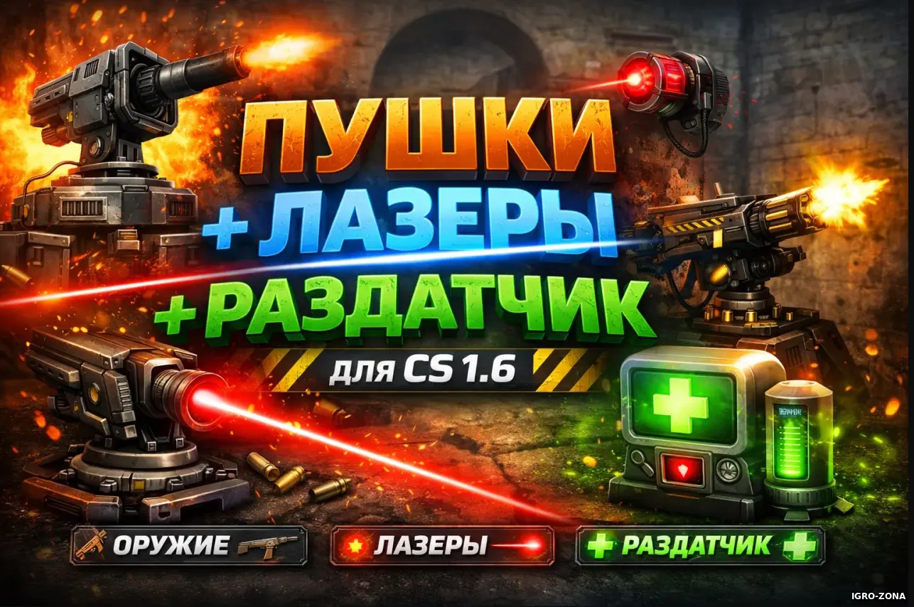 Готовая сборка мода «Пушки + Лазеры + Раздатчик» добавляет на сервер Counter-Strike 1.6 возможность установки автоматических пушек, лазерных ловушек и раздатчиков здоровья. Решение идеально подходит для CSDM-серверов, а также для fun-режимов с активным экшеном и прокачкой. Главная особенность сборки — объединение всех ключевых функций в единую оптимизированную систему, что положительно сказывается на стабильности сервера и игровом процессе.