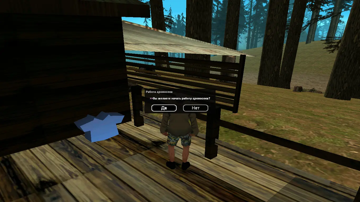 Работа для дровосека, хорошее дополнение для Вашего SAMP сервера. Нанимаемся, идём к пикапу у дерева, включается анимация работы с пилой, по окончанию в руках появляются дрова, которые нужно отнести в дом. Получаем деньги при продаже дров (после их сбора).