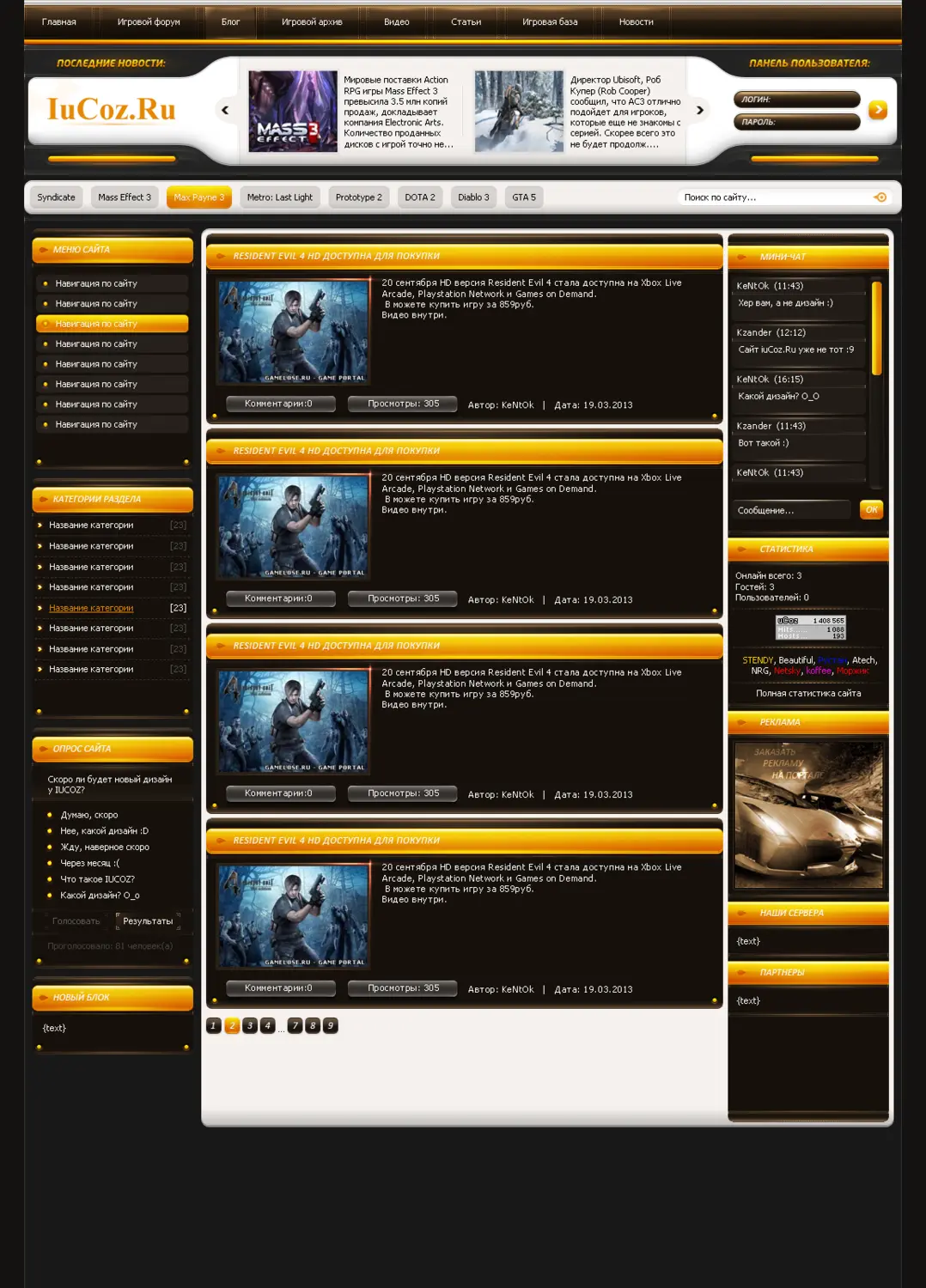 Очень красивый макет под названием - GameLose. Макет выполнен в темных тонах, как видно на скрине: два контейнера, в шапке лого/слайдер/форма входа/мини-профиль, чуть выше горизонтальное меню, чуть ниже еще одно меню и поиск. Обычный, почти, вид материалов, низа в макете нету. В архиве одно psd главной.